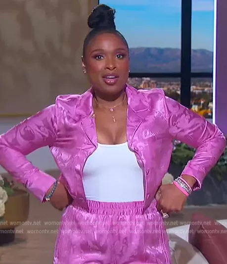 Jennifer Hudson on The Jennifer Hudson Show on FOX was spotted wearing this pink paisley cropped top on The Jennifer Hudson Show on Oct 11 2022's episode. Jennifer's Top is the Cropped Pajama Top by Fleur du Mal . Jennifer's Pants is the Pajama Track Pant by Fleur du Mal.