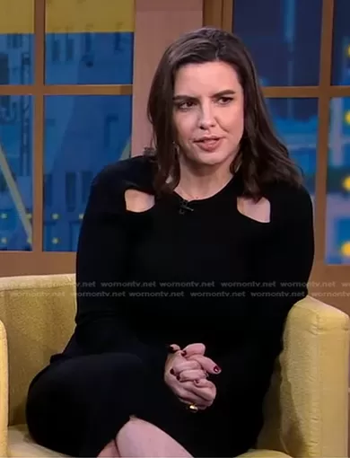 on Good Morning America on ABC was spotted wearing this black ribbed cutout dress on Good Morning America on Oct 13 2022's episode. 's Dress is the Cut-Out Long Sleeve Dress by And Now This.