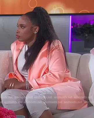 Jennifer Hudson on The Jennifer Hudson Show on FOX was spotted wearing this satin shawl collar blazer on The Jennifer Hudson Show on Oct 13 2022's episode. Jennifer's Blazer is the Kylie Shawl-Collar Jacket by Alice + Olivia . Jennifer's Pants is the Allyn Pant by Ramy Brook.