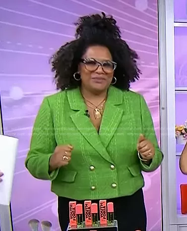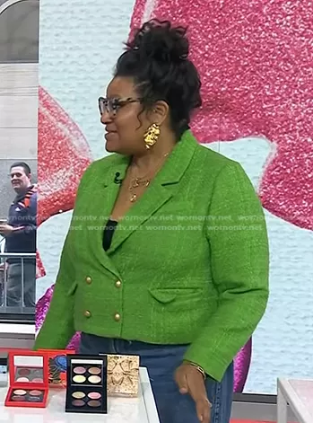 on Today on NBC was spotted wearing this green plaid blazer on Today on Apr 18 2024's episode. 's Jacket is the Textured Double Breasted Blazer by Zara . 's Earrings is the Crumpled Gold Large Post Earrings by Alexis Bittar.