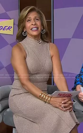 Hoda Kotb on Today on NBC was spotted wearing this metallic ribbed dress on Today on Dec 26 2022's episode. Hoda's Dress is the Dress with Metallic Thread by Zara . Hoda's Earrings is the 2022 Hope Hoops by Jennifer Miller.