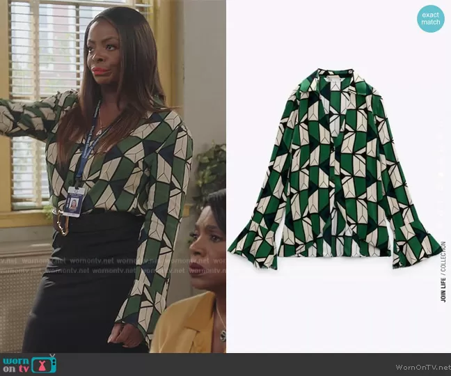 Ava Coleman (played by Janelle James) on Abbott Elementary on ABC was spotted wearing this green geometric print blouse on Abbott Elementary on episode 'The Principal's Office' (2x04) in Oct 2022. Ava's Top is the Ruffled Geometric Printed Blouse by Zara.