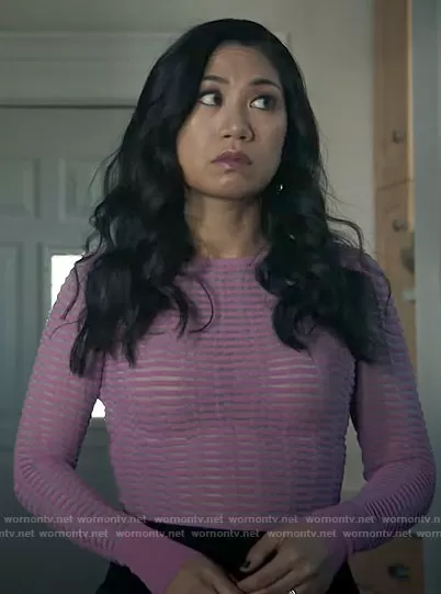 Melody Bayani (played by Liza Lapira) on The Equalizer on CBS was spotted wearing this pink mesh stripe top on The Equalizer on episode 'Better Off Dead' (3x03) in Oct 2022. Mel's Top is the Shadow Stripe Long Sleeve Top by Herve Leger.