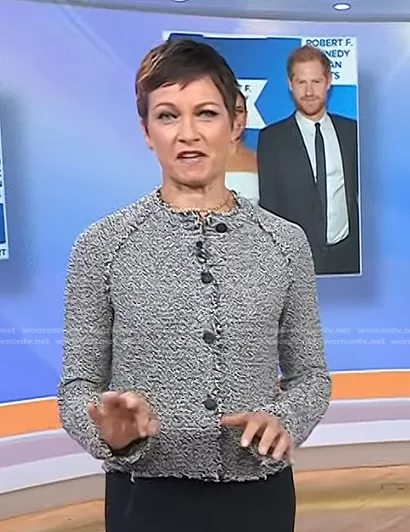 Stephanie Gosk on Today on NBC was spotted wearing this black tweed jacket on Today on Mar 13 2023's episode. Stephanie's Jacket is the Marisa Tweed Jacket by Rag & Bone.