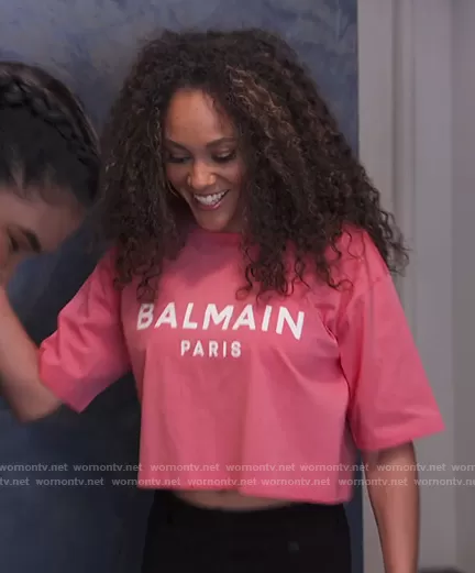 Ashley Darby on The Real Housewives of Potomac on Bravo was spotted wearing this pink Balmain crop top on The Real Housewives of Potomac on episode 'Allegation Nation' (7x02) in Oct 2022. Ashley's Top is the Pink Cropped Logo T-Shirt by Balmain.