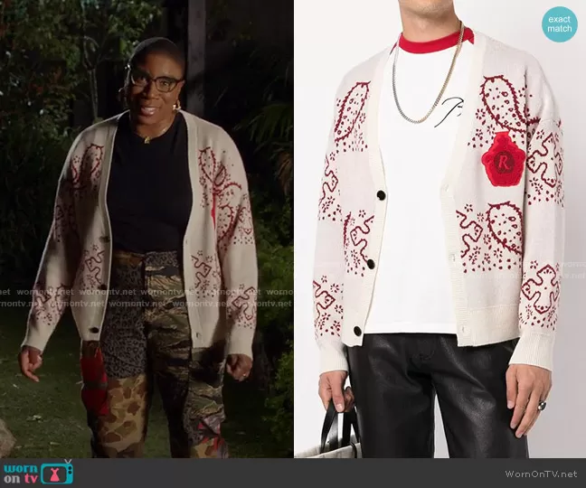 Henrietta Wilson (played by Aisha Hinds) on 9-1-1 on ABC was spotted wearing this white paisley cardigan and camo pants on 9-1-1 on episode 'Home Invasion' (6x05) in Oct 2022. Hen's Sweater is the Intarsia-Knit Cardigan by Rhude . Hen's Pants is the Mix-Print Cargo Trousers by Palm Angels . Hen's Shoes is the Jordan 1 Mid Sneakers by Nike.