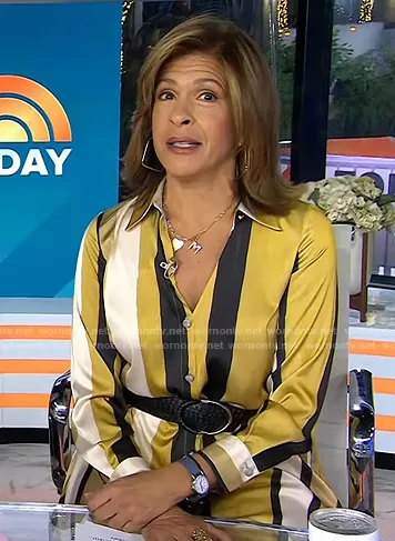 Hoda Kotb on Today on NBC was spotted wearing this yellow striped shirtdress on Today on Jan 29 2023's episode. Hoda's Dress is the Striped Belted Shirt Dress by Zara.