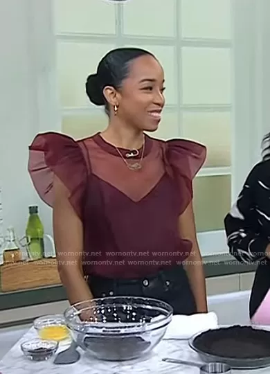 on Today on NBC was spotted wearing this burgundy ruffle tulle top on Today on Oct 18 2022's episode. 's Top is the Corina Organza Ruffle Top by Jonathan Simkhai.
