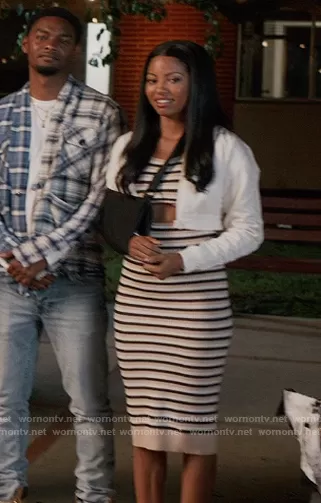 Thea (played by Camille Hyde) on All American Homecoming on CWTV was spotted wearing this stripe cutout waist dress on All American Homecoming on episode 'No Love' (2x02) in Oct 2022. Thea's Dress is the Liberty Stripe Cutout Long Sleeve Midi Dress by 4th & Reckless.