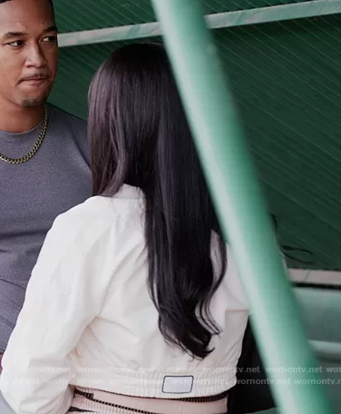 Thea (played by Camille Hyde) on All American Homecoming on CWTV was spotted wearing this white cropped jacket on All American Homecoming on episode 'No Love' (2x02) in Oct 2022. Thea's Jacket is the Prizewinner Crop Bomber Jacket by Alo.