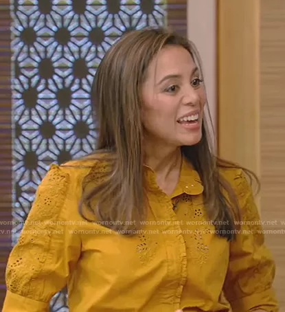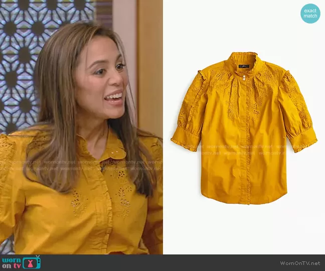 on Live with Kelly and Mark on Disney ABC Home Entertainment was spotted wearing this orange embroidered top on Live with Kelly and Ryan on Oct 18 2022's episode. 's Top is the Mockneck embroidered blouse by J. Crew.