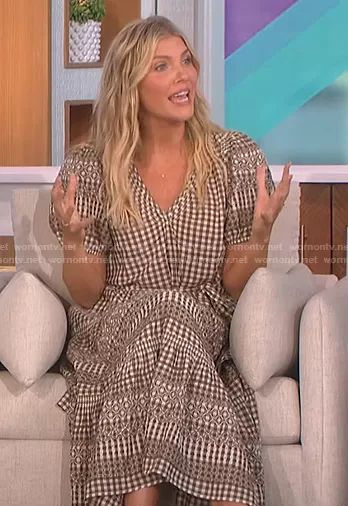 Amanda Kloots on The Talk on CBS was spotted wearing this brown check embroidered dress on The Talk on Oct 18 2022's episode. Amanda's Dress is the The Cross-Stitch Embroidered Dakota Maxi Dress by The Great.