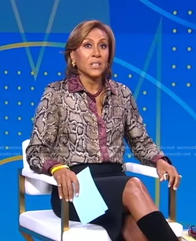 Robin Roberts on Good Morning America on ABC was spotted wearing this snake print blouse on Good Morning America on Apr 11 2024's episode. Robin's Top is the Slim Snake-Printed Silk Shirt by Victoria Beckham.