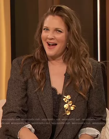 Drew Barrymore on The Drew Barrymore Show on CBS was spotted wearing this gray double breasted blazer on The Drew Barrymore Show on Oct 19 2022's episode. Drew's Blazer is the Alpha Everynight wool-blend blazer by Blaze Milano . Drew's Pants is the Alpha Banker wool-blend trousers by Blaze Milano . Drew's Earrings is the Clipon Doorknocker Earrings by Jennifer Miller.