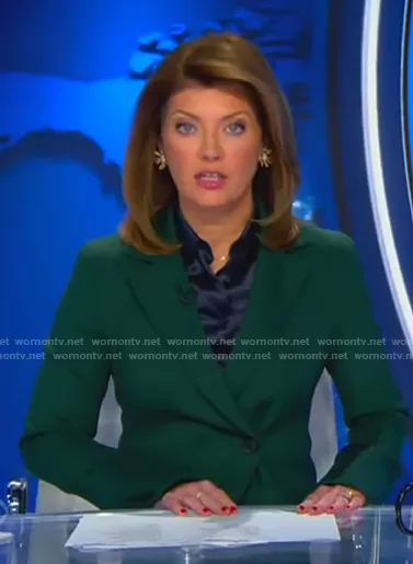 Norah O'Donnell on CBS Evening News on CBS was spotted wearing this green blazer on CBS Evening News on Oct 19 2022's episode. Norah's Jacket is the Lorenz Asymmetric Button Jacket by Akris.