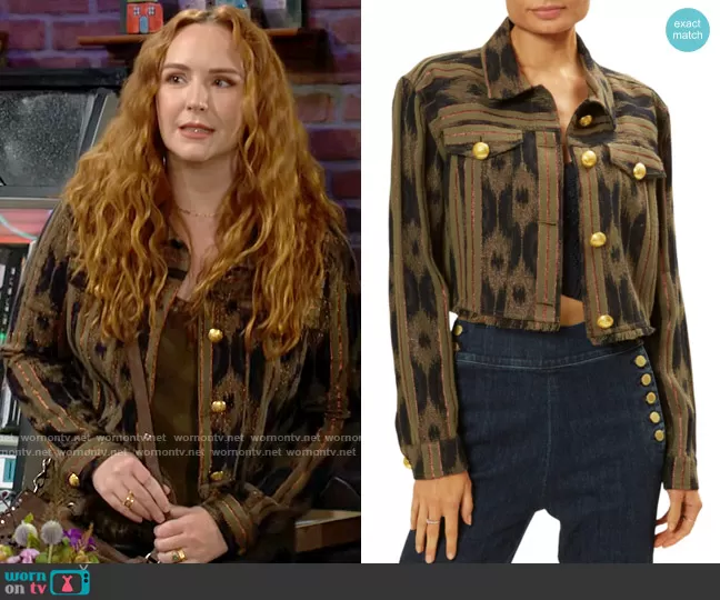 Mariah Copeland (played by Camryn Grimes) on The Young and the Restless on CBS was spotted wearing this olive green printed jacket with gold buttons on The Young and the Restless on Oct 20 2022's episode. Mariah's Jacket is the Izabelle Jacket by Ramy Brook.