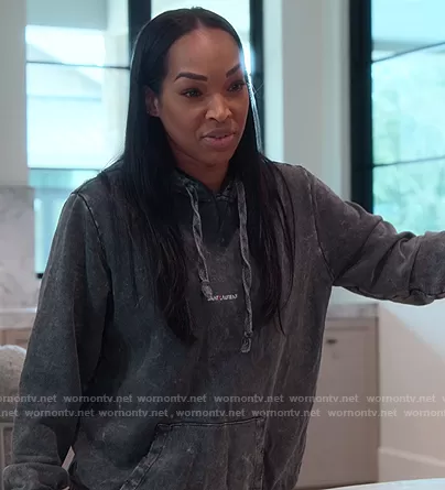 (played by Malika Haqq) on The Kardashians on Hulu was spotted wearing this black Saint Laurent logo hoodie on The Kardashians on episode 'One Night In Miami' (2x05) in Oct 2022. 's Sweater is the Printed logo distressed hoodie by Saint Laurent.