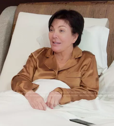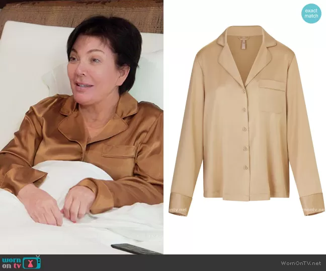 Kris Jenner (played by Kris Jenner) on The Kardashians on Hulu was spotted wearing this brown satin pajama top on The Kardashians on episode 'One Night In Miami' (2x05) in Oct 2022. Kris's Top is the Silk Button Up Shirt by Skims.