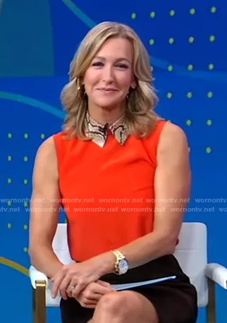 Lara Spencer on Good Morning America on ABC was spotted wearing this orange sleeveless top with physon collar on Good Morning America on Apr 13 2023's episode. Lara's Top is the Python Trimmed Silk Top by Gucci.