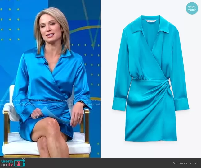 Amy Robach on Good Morning America on ABC was spotted wearing this blue satin wrap dress on Good Morning America on Oct 20 2022's episode. Amy's Dress is the Satin Effect Wrap Dress by Zara . Amy's Earrings is the Vector Drops by Accessory Concierge.