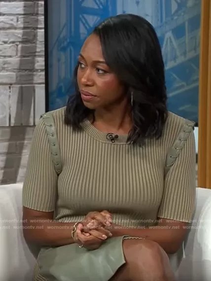 on CBS Mornings on CBS was spotted wearing this green leather panel dress on CBS Mornings on Oct 20 2022's episode. 's Dress is the Gianina Dress by Jonathan Simkhai.