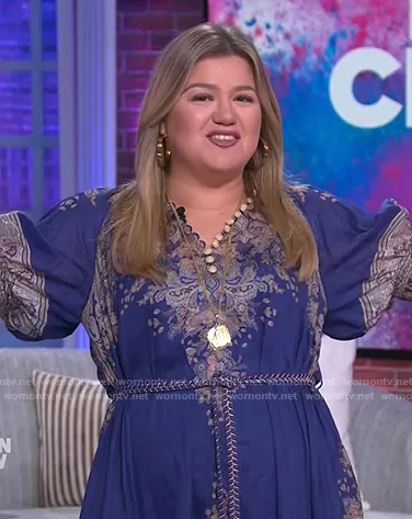 Kelly Clarkson on The Kelly Clarkson Show on NBC was spotted wearing this purple paisley print dress on The Kelly Clarkson Show on Oct 20 2022's episode. Kelly's Dress is the Anneke Belted Paisley Swing Maxi Dress by Zimmermann.
