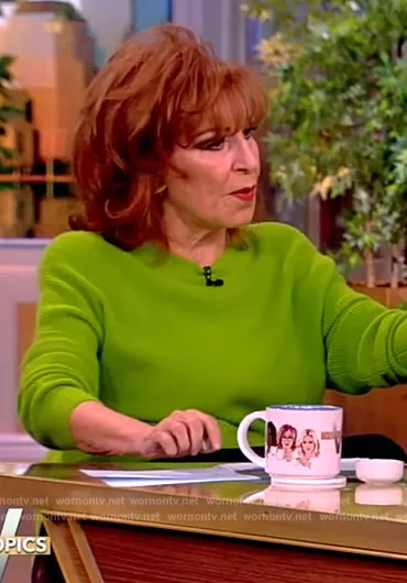 Joy Behar on The View on ABC was spotted wearing this lime green ribbed sweater on The View on Mar 22 2024's episode. Joy's Sweater is the Caprice Cashmere Crewneck Drop Shoulder Pullover by Alice + Olivia.