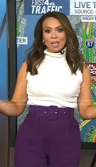 Adelle Caballero on Today on NBC was spotted wearing this purple belted pants on Today on Oct 21 2022's episode. Adelle's Pants is the Pants with Fabric Covered Belt by Zara.