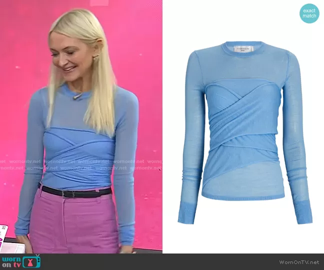 on Today on NBC was spotted wearing this blue wrap mesh top on Today on Oct 21 2022's episode. 's Top is the Paneled Merino Wool Top by Victoria Beckham.