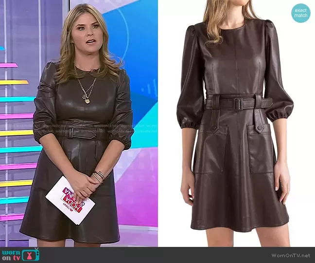 Jenna Bush Hager on Today on NBC was spotted wearing this brown leather belted dress on Today on Jan 02 2023's episode. Jenna's Dress is the Broome Faux Leather Dress by Shoshanna.