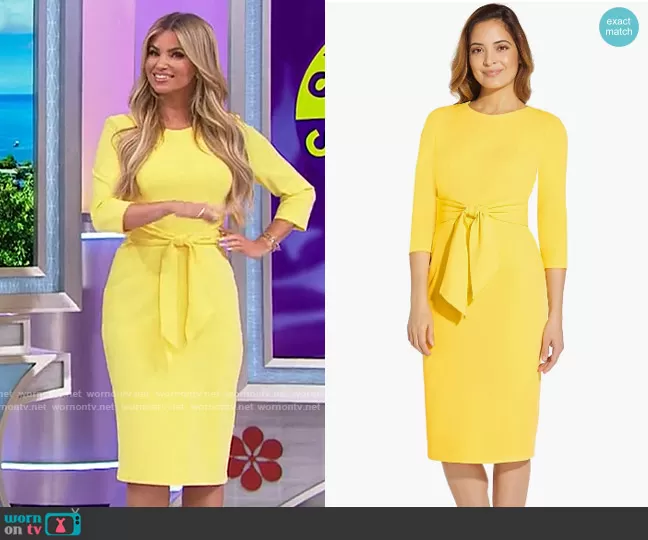 Amber Lancaster on The Price is Right on CBS was spotted wearing this yellow tie-waist dress on The Price is Right on Mar 15 2024's episode. Amber's Dress is the Knit Crepe Tie Waist Sheath Dress in Canary Yellow by Adrianna Papell.