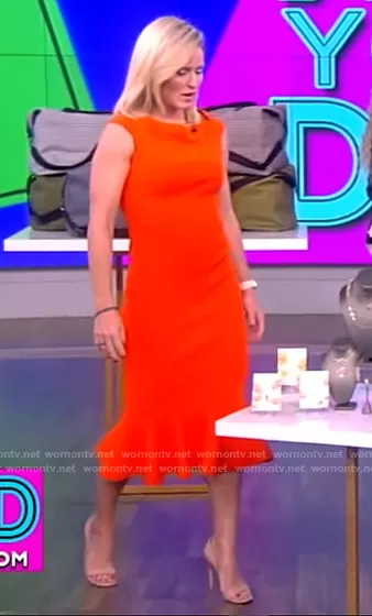 Sara Haines on The View on ABC was spotted wearing this orange mermaid hem dress on The View on Oct 24 2022's episode. Sara's Dress is the Sirene off-the-shoulder ribbed stretch-knit midi dress by Alexander McQueen.