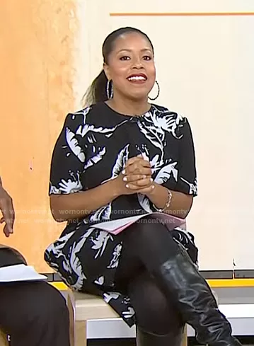 Sheinelle Jones on Today on NBC was spotted wearing this black leaf print dress on Today on Oct 24 2022's episode. Sheinelle's Dress is the Birds of Prey Dress by Adam Lippes Collective.