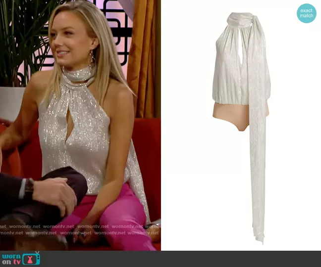 Abby Newman (played by Melissa Ordway) on The Young and the Restless on CBS was spotted wearing this metallic tie neck top on The Young and the Restless on Oct 24 2022's episode. Abby's Top is the Chiffon Bodysuit by Halston.