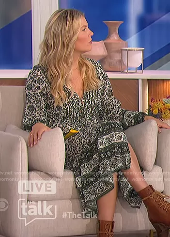 Amanda Kloots on The Talk on CBS was spotted wearing this green printed dress on The Talk on Oct 24 2022's episode. Amanda's Dress is the Kameya Floral Print Long Sleeve Dress by Veronica Beard.
