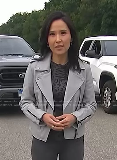 Vicky Nguyen on Today on NBC was spotted wearing this grey print top and moto jacket on Today on Oct 24 2022's episode. Vicky's Top is the Animal Burnout Crew Neck Top by Whistles . Vicky's Jacket is the Fern Leather Biker Jacket by All Saints.