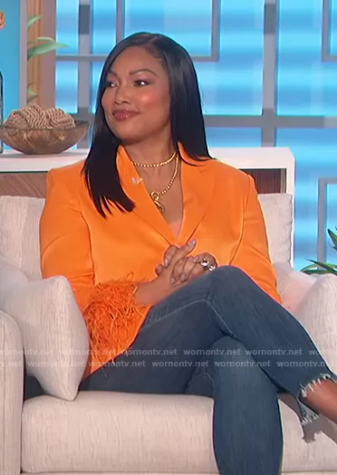 on The Talk on CBS was spotted wearing this orange feather cuff blazer on The Talk on Oct 24 2022's episode. 's Blazer is the Satin Feather Trim Blazer by Zara.