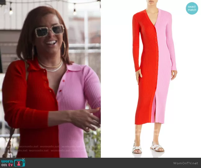 Robyn Dixon on The Real Housewives of Potomac on Bravo was spotted wearing this pink colorblock dress on The Real Housewives of Potomac on episode 'Stand in Your Truth' (7x03) in Oct 2022. Robyn's Dress is the Shoko Dress in Poppy Rosebud by Staud . Robyn's Sunglasses is the Chain Rectangle Metal Sunglasses with Straps by Gucci . Robyn's Bag is the Loop Small suede shoulder bag by Bottega Veneta.