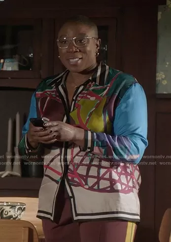 Henrietta Wilson (played by Aisha Hinds) on 9-1-1 on ABC was spotted wearing this mixed print satin shirt on 9-1-1 on episode 'Tomorrow' (6x06) in Oct 2022. Hen's Top is the Aseia Painterly-Print Shirt by Munthe . Hen's Pants is the College Track Pant by Palm Angels.