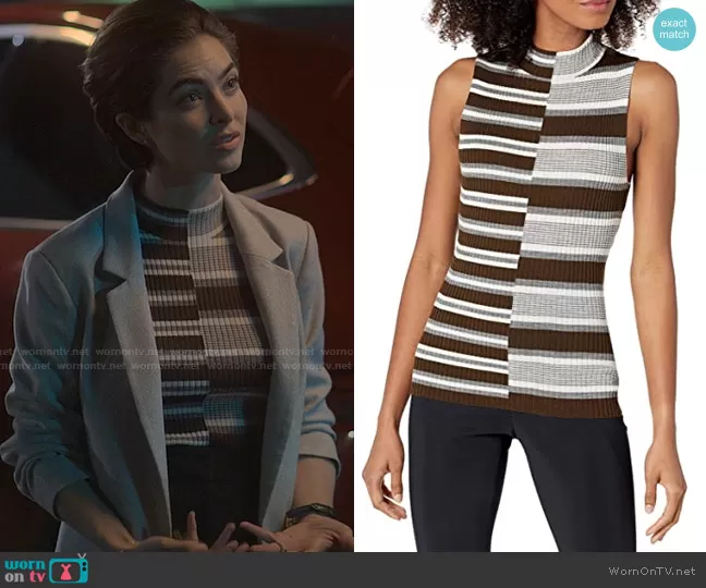 Sarah Miller (played by Brooke Lyons) on Reasonable Doubt on Hulu was spotted wearing this brown striped ribbed top on Reasonable Doubt on episode 'Renegade' (1x06) in Oct 2022. Sarah's Top is the Wool Multi-Stripe Sleeveless Sweater by Theory.