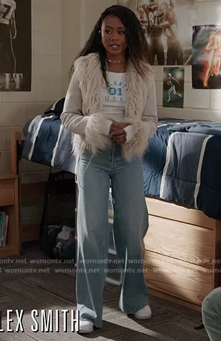 Keisha (played by Netta Walker) on All American Homecoming on CWTV was spotted wearing this white fur trim jacket on All American Homecoming on episode 'Me, Myself & I' (2x03) in Oct 2022. Keisha's Jacket is the Tie Front Jacket by H&M . Keisha's Pants is the The Roller High Rise Wide Leg Jeans in Let's Trip by Mother.