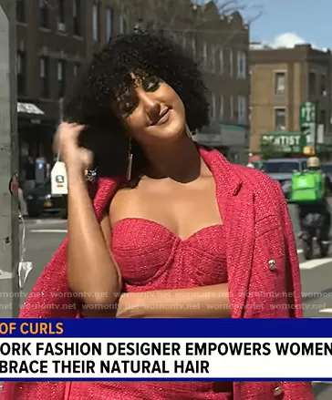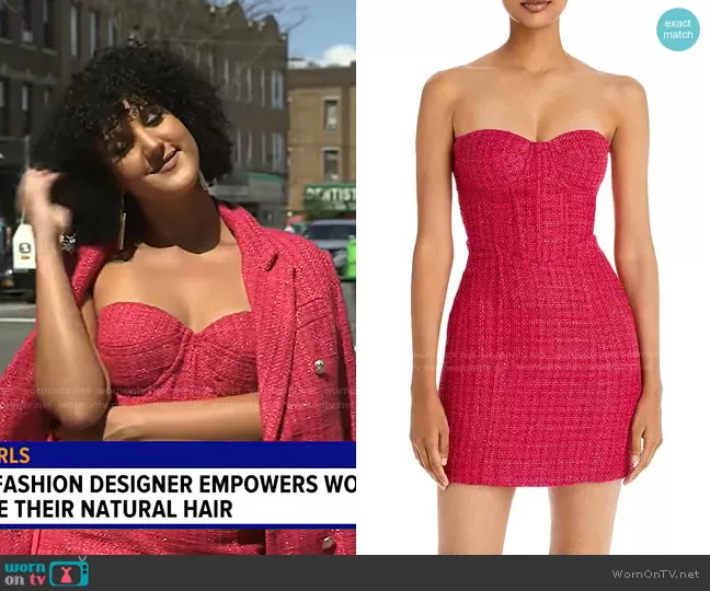 on Good Morning America on ABC was spotted wearing this pink tweed dress and blazer on Good Morning America on Oct 25 2022's episode. 's Dress is the Tweed Bustier Dress by AQUA x Maeve Reilly . 's Jacket is the Tweed Double Breasted Blazer by AQUA x Maeve Reilly.