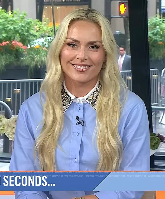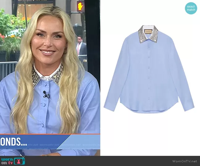 on Today on NBC was spotted wearing this blue embellished collar blouse on Today on Oct 26 2022's episode. 's Top is the Crystal-embellished collar shirt by Gucci . 's Pants is the Straight-leg satin trousers by Gucci.