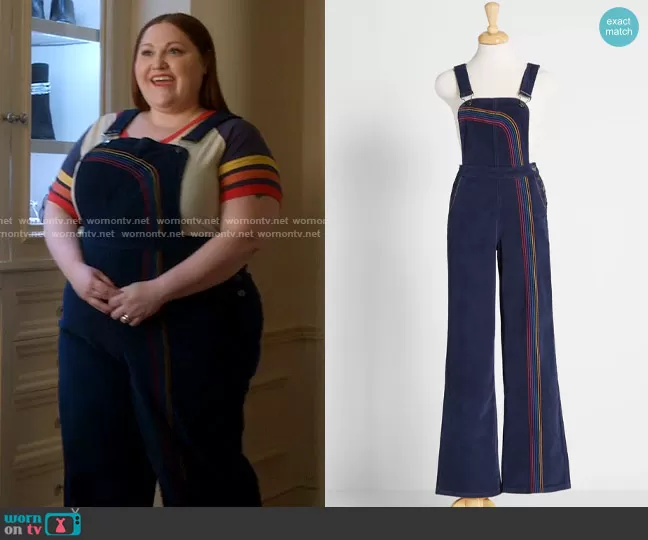 Gigi Taylor-Roman (played by Beth Ditto) on Monarch on Fox was spotted wearing this rainbow embroidered overalls on Monarch on episode 'About Last Night' (1x07) in Oct 2022. Gigi's Overalls is the Rainbow With Me Corduroy Overalls by ModCloth.
