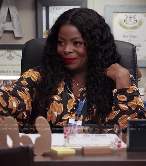 Ava Coleman (played by Janelle James) on Abbott Elementary on ABC was spotted wearing this black floral print blouse on Abbott Elementary on episode 'Read-A-Thon' (2x11) in Jan 2023. Ava's Top is the Winslow Pleated Floral Shirt by Jonathan Simkhai.