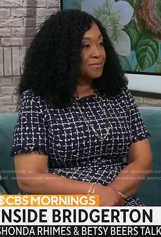 Oscar de la Renta Asymmetric Check Tweed Dress worn by Shonda Rhimes on CBS Mornings