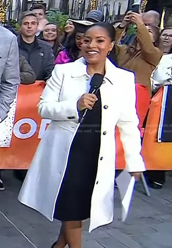 Sheinelle Jones on Today on NBC was spotted wearing this white coat on Today on Nov 05 2025's episode. Sheinelle's Coat is the Classic Lady Day Coat in Italian Double-Cloth Wool with Thinsulate by J. Crew.