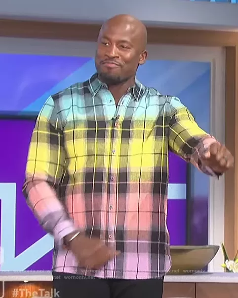 Akbar Gbajabiamila on The Talk on CBS was spotted wearing this rainbow plaid shirt on The Talk on Oct 27 2022's episode. Akbar's Shirt is the Gradient Check Flannel Sport Shirt by Scotch and Soda.