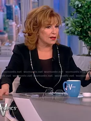 Joy Behar on The View on ABC was spotted wearing this black embellished trim blazer on The View on Oct 28 2022's episode. Joy's Blazer is the Jagger Dickey Jacket by Veronica Beard . Joy's Pants is the Millicent Crystal Side Stripe Satin Pants by Veronica Beard.