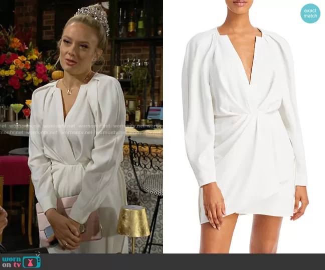 Abby Newman (played by Melissa Ordway) on The Young and the Restless on CBS was spotted wearing this white long sleeved mini wrap dress on The Young and the Restless on Oct 28 2022's episode. Abby's Dress is the Nadine Dress by IRO .